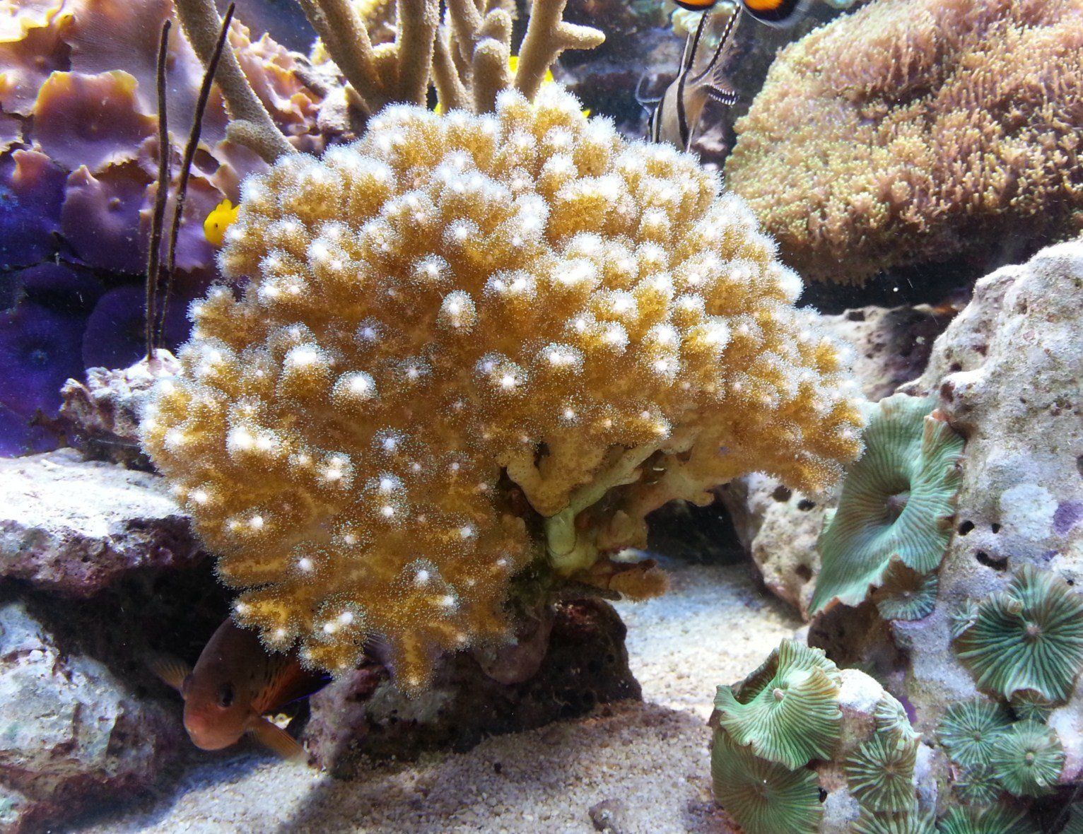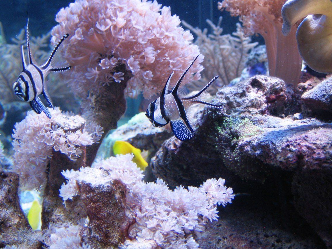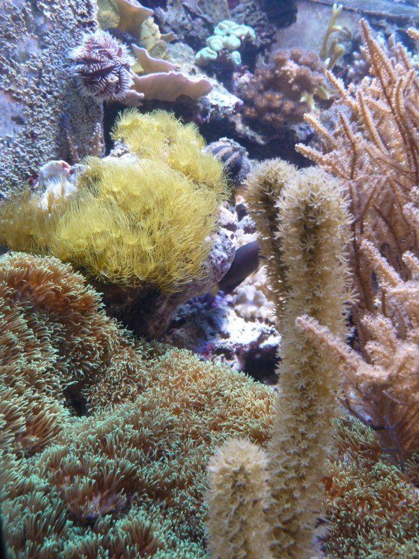 Schwämme (collospongia auris, pseudosuberites andrewsi), pumpende Xenien (xenia umbellata), Bäumchenweichkoralle (capnella imbricata), Pilzlederkoralle (sarcophyton sp.), Ohrenlederkoralle (sinularia dura), Gorgonien (pinnigorgia sp., plexaura flexuosa), Kalkachsenkoralle (briareum sp.), Scheibenanemonen (discosoma sp., rhodactis sp.), Kupferanemone (entacmea quadricolor), Krustenanemonen (zoanthus, terrazoanthus), blaue Koralle (heliopora), LPS-Steinkorallen (echinopora, pavona decussata, hydnophora rigida, caulastrea furcata, euphillia), SPS-Steinkorallen (montipora, acropora, pocillopora, seriatopora, porites cylindrica, stylophora pistillata milka)
